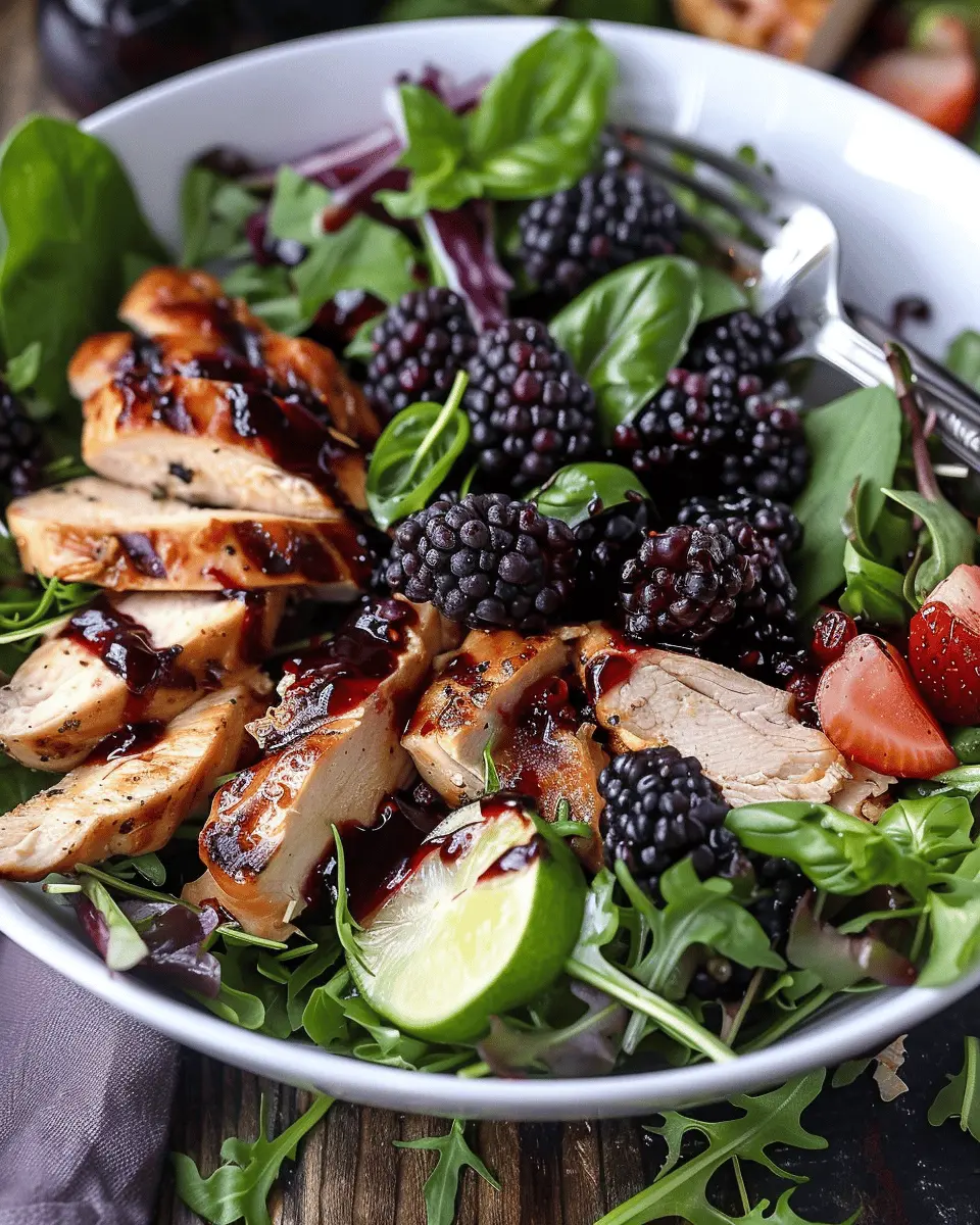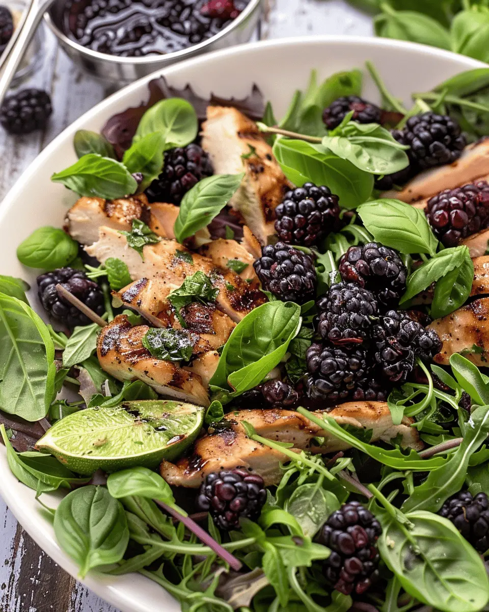 A delicious and refreshing salad featuring grilled chicken, fresh blackberries, and basil.