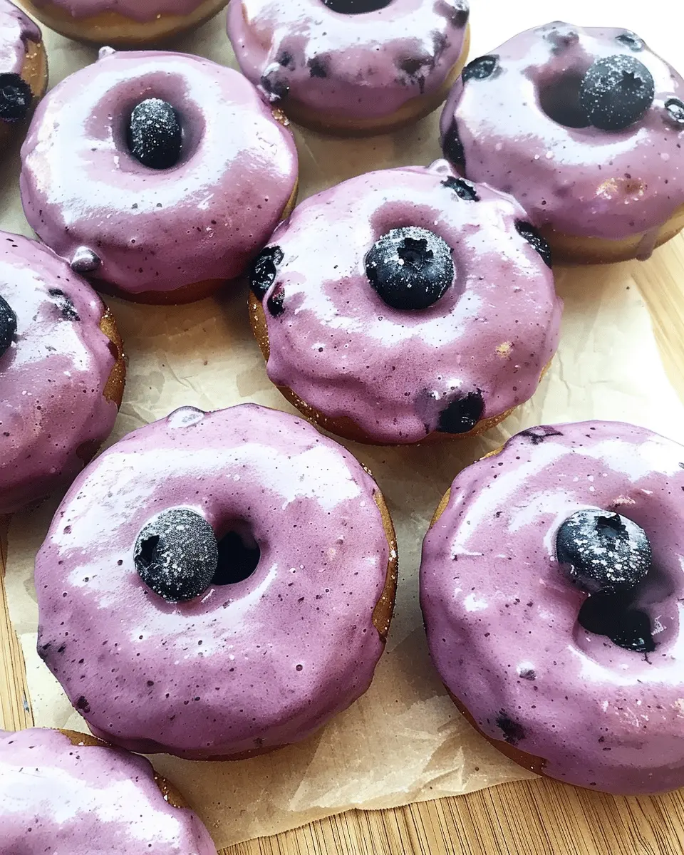 Once the donuts have completely cooled, dip the tops in the blueberry glaze. The glaze should drizzle down the sides for a beautiful finish, so don’t be shy with it. Allow the glaze to set for a few minutes, then they’re ready to serve!