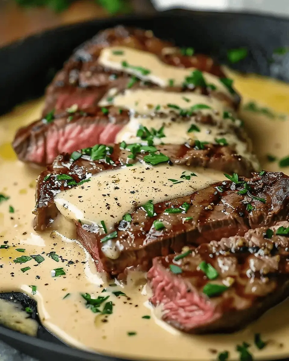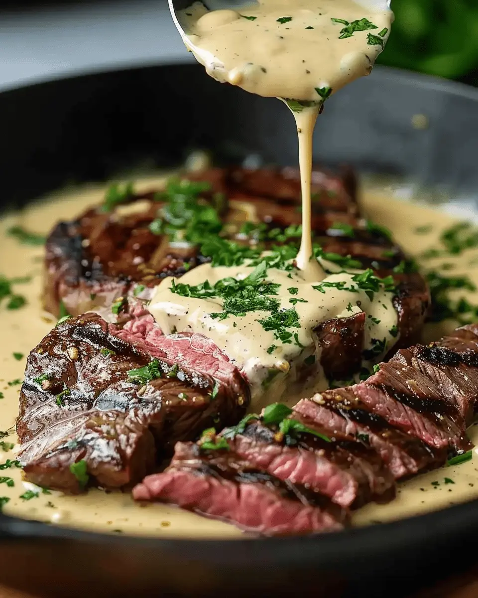 Keywords: Cast Iron Bavette Steak, Whiskey Garlic Cream Sauce