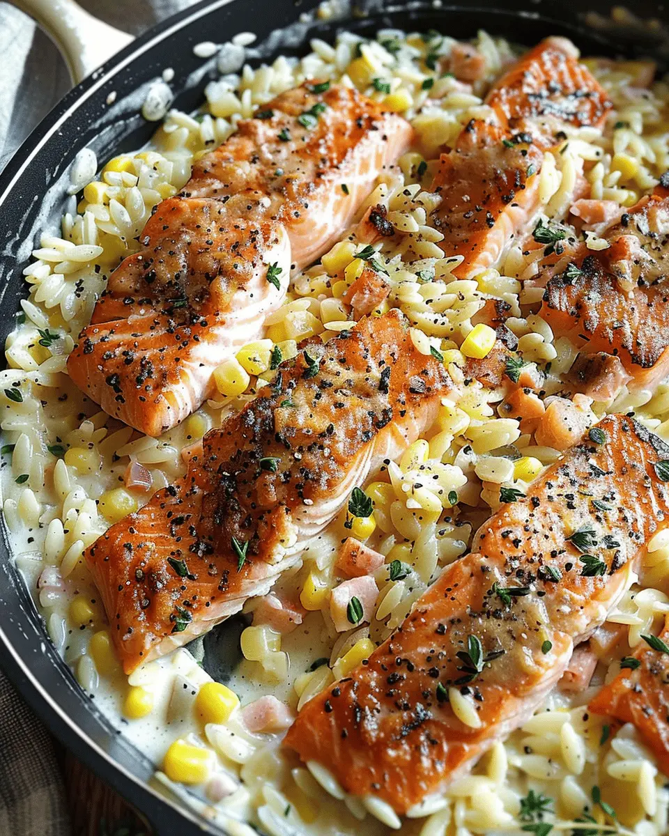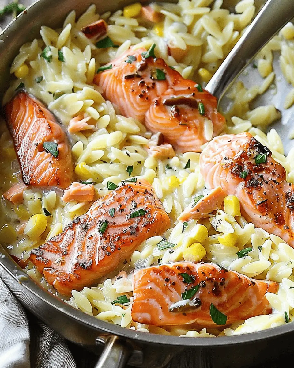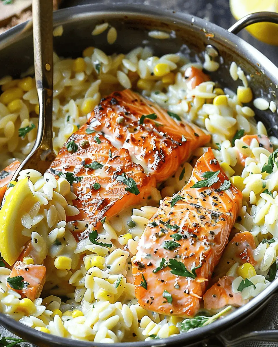 A creamy and comforting dish featuring orzo pasta, sweet corn, and tender salmon, perfect for a weeknight dinner.