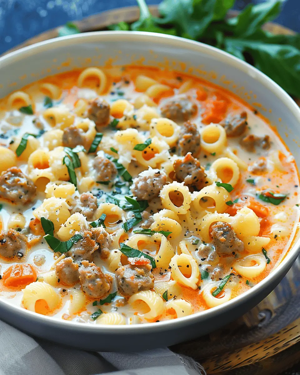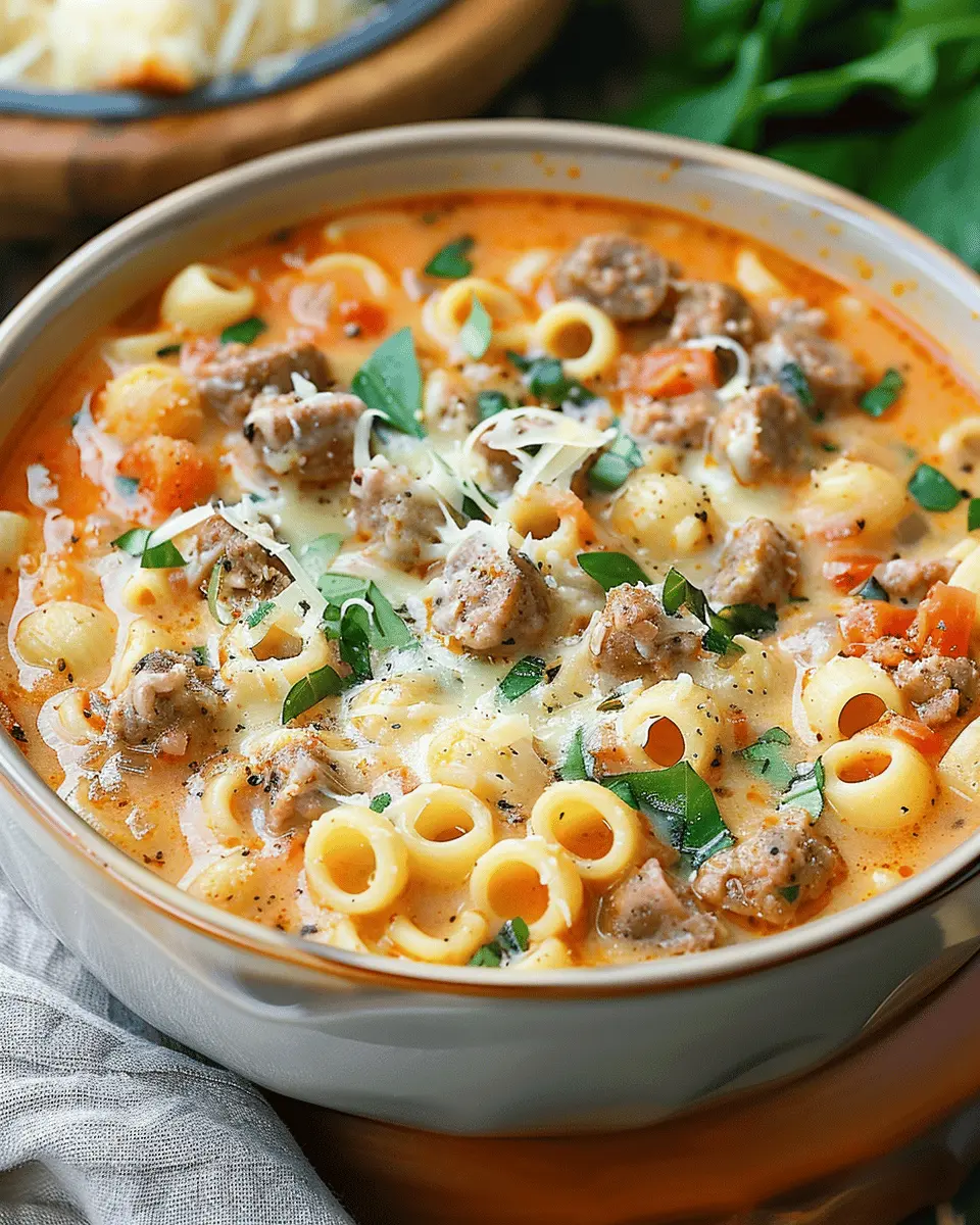 A warm and hearty soup perfect for chilly nights, featuring Italian sausage, ditalini pasta, and a creamy Parmesan broth.