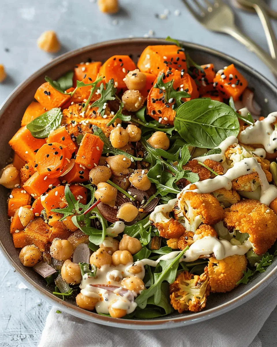 Add the roasted veggies: Pile on those beautiful roasted carrots, cauliflower, sweet potatoes, and crispy chickpeas.