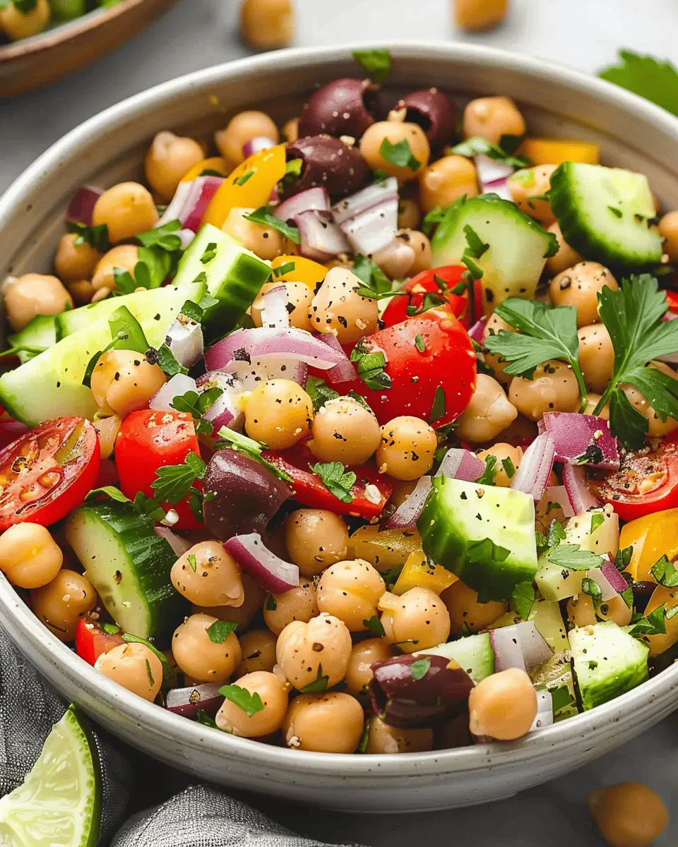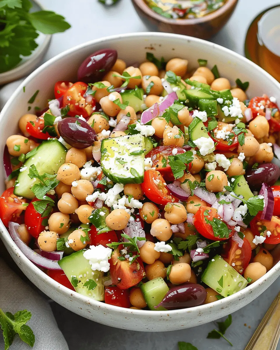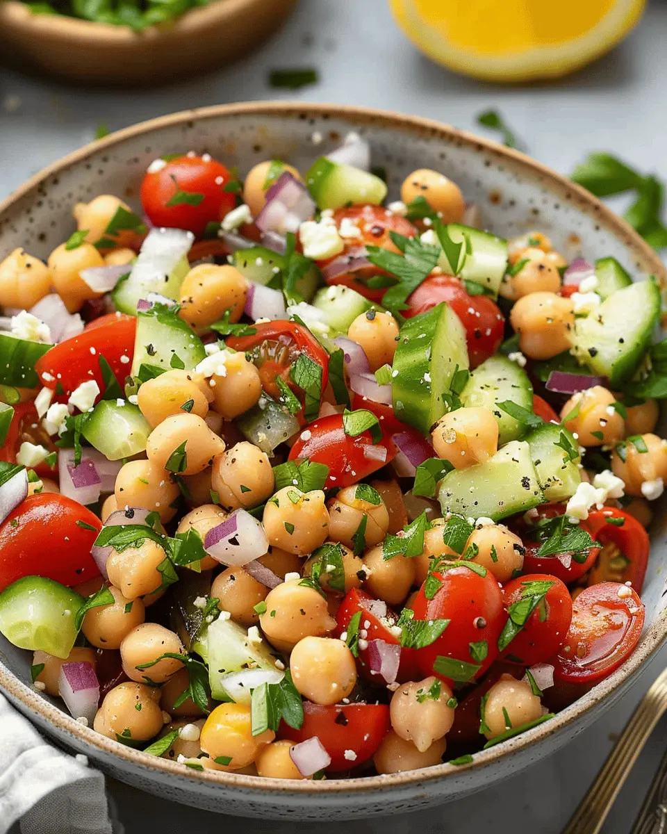 A delightful and healthy Mediterranean chickpea salad that combines fresh vegetables and a zesty dressing.