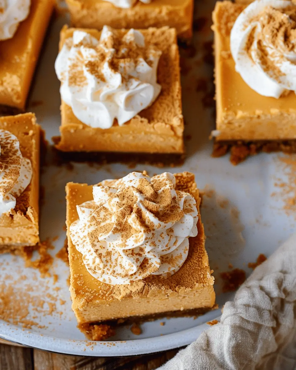 Absolutely! No bake pumpkin cheesecake bars are perfect for make-ahead dessert plans. You can prepare them up to two days in advance and store them in the refrigerator. Simply let them chill until set and then slice them for a ready-to-serve treat when you have guests coming over or if you’re just looking to enjoy a slice of fall flavor any time. This also allows the flavors to meld beautifully, enhancing the overall taste!