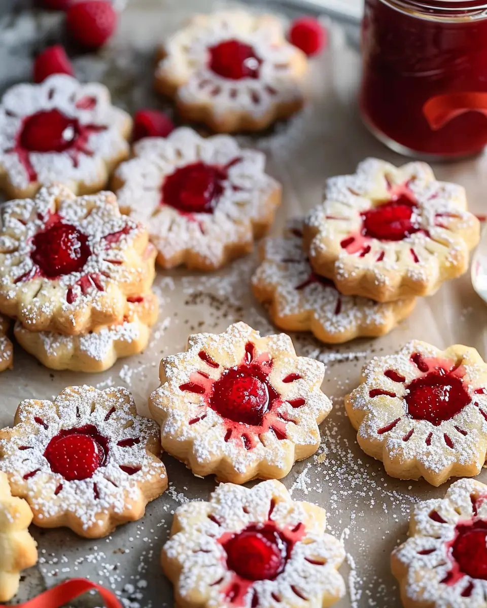 To add a touch of elegance, dust the tops of the cutout cookies with powdered sugar once they have cooled completely. This snowy topping not only looks pretty but also adds a subtle sweetness that complements the tartness of the raspberry jam.