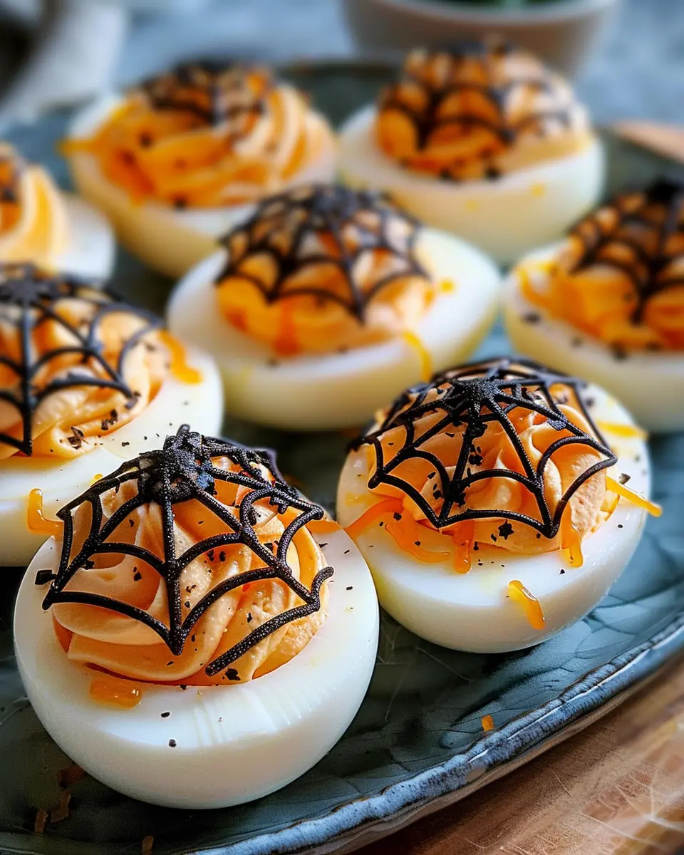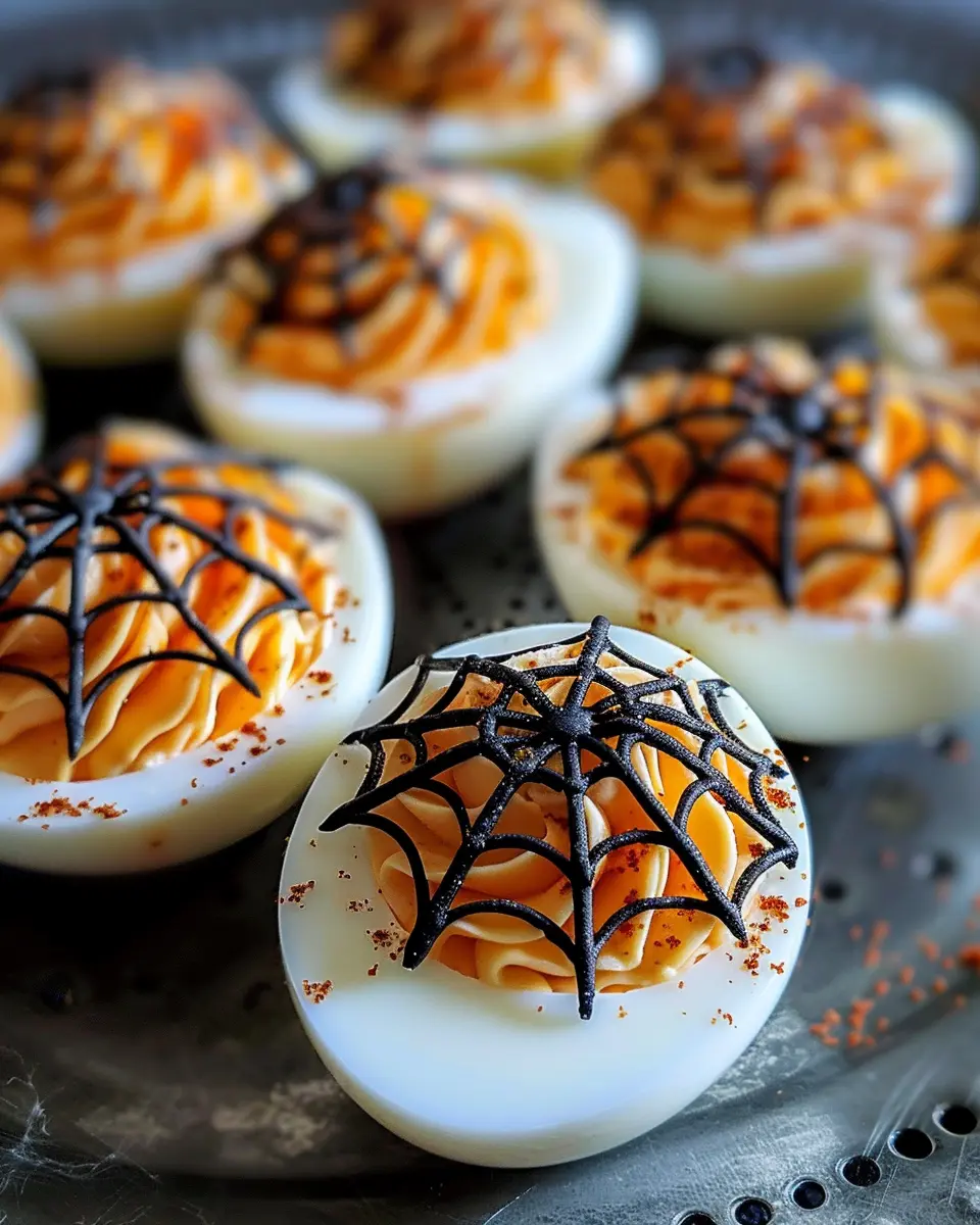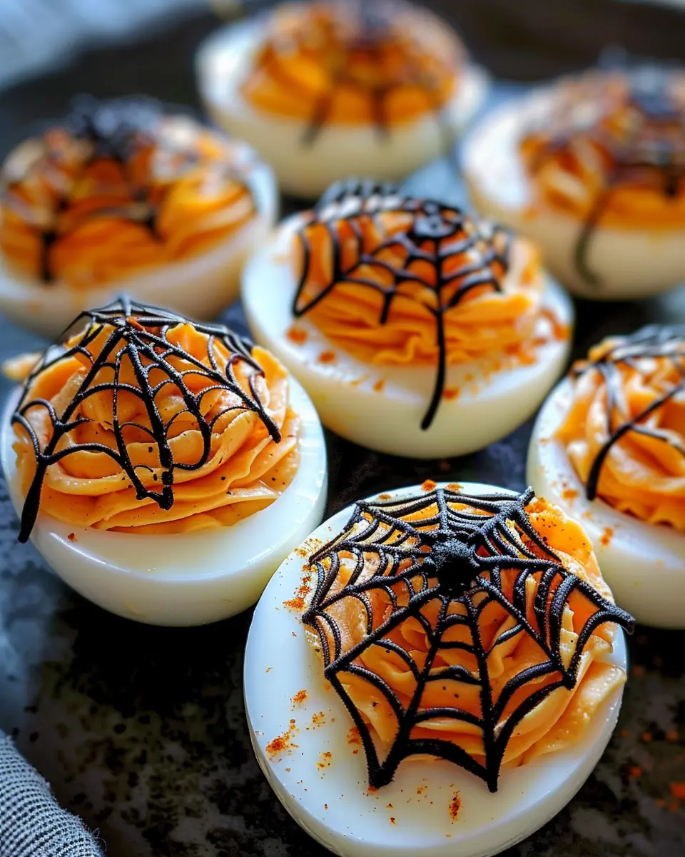 Keywords: Spooky Spiderweb Deviled Eggs, Halloween appetizer, deviled eggs